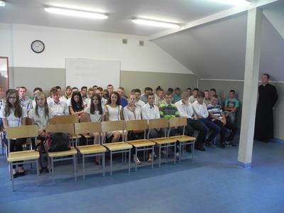 Szczególne słowa powitania skierowała do pierwszoklasistów. W tym roku szkolnym do klasy I Zasadniczej Szkoły Zawodowej uczęszczać będzie 18 uczniów. Uczniowie Ci wybrali różne zawody. Są wśród nich przyszli elektrycy, fryzjerki, sprzedawcy, monterzy sieci instalacji i urządzeń sanitarnych, piekarze, mechanicy pojazdów samochodowych i murarze. Życzyny aby zawód, który wybrali okazał się tym właściwym i przyniósł w przyszłości satysfakcję z pracy i godziwe zarobki.