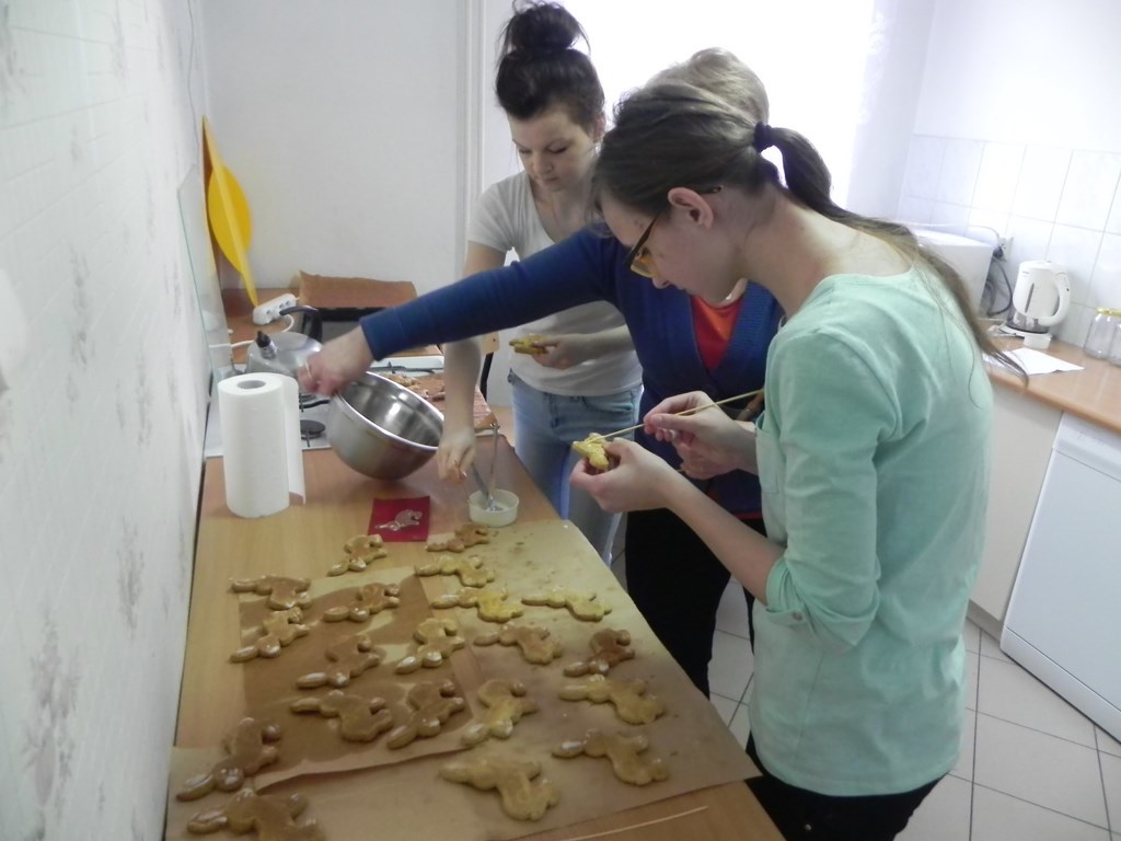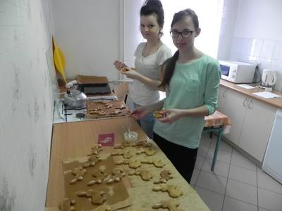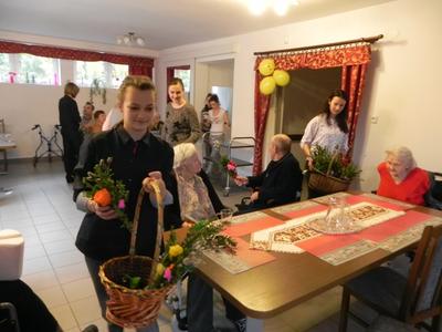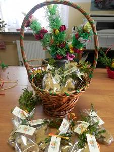 Uczniowie przekazali nauczycielom i pracownikom szkoły piernikowe zajączki wielkanocne wykonane przez uczennice klasy I ZSZ oraz życzenia świąteczne od całej społeczności szkolnej.