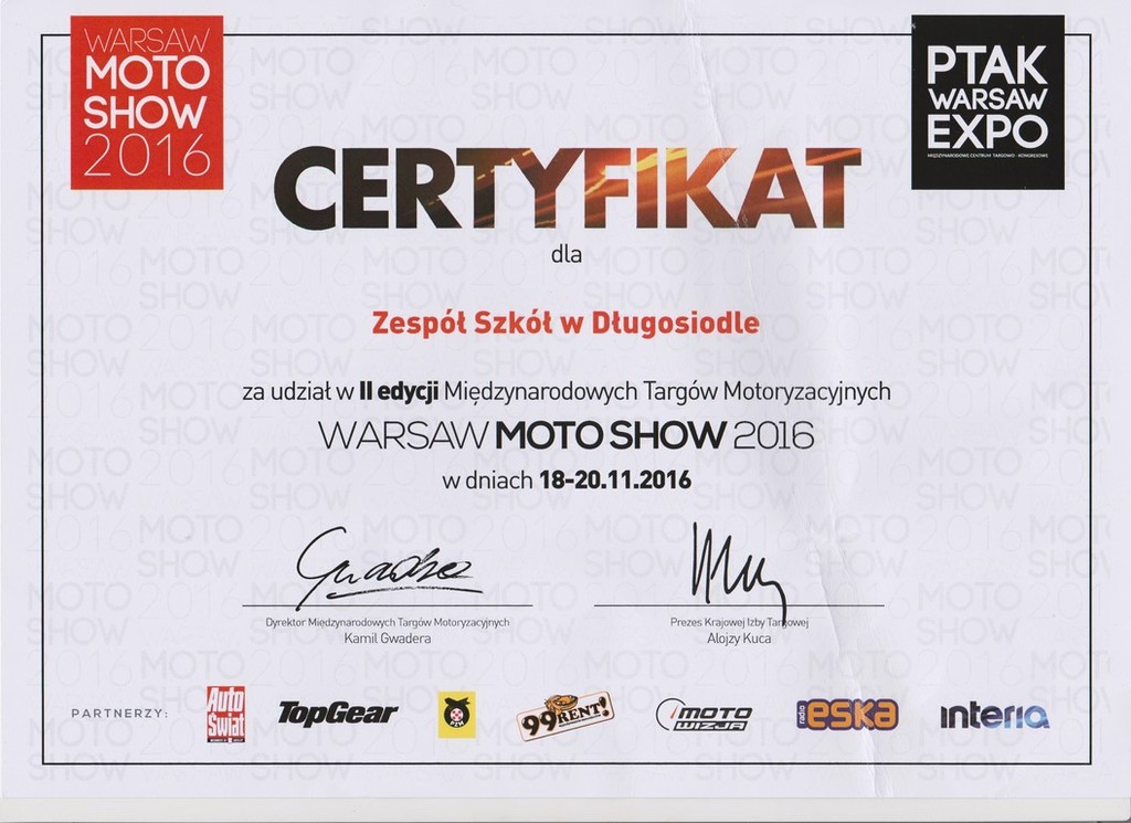 18 listopada 2016r. (w piątek) uczniowie Zasadniczej Szkoły Zawodowej i Liceum Ogólnokształcącego dla Dorosłych wraz z grupą gimnazjalistów z Długosiodła uczestniczyli w II edycji WARSAW MOTOSHOW 2016.