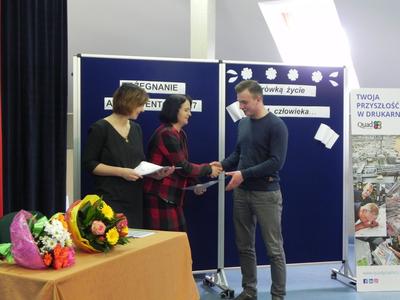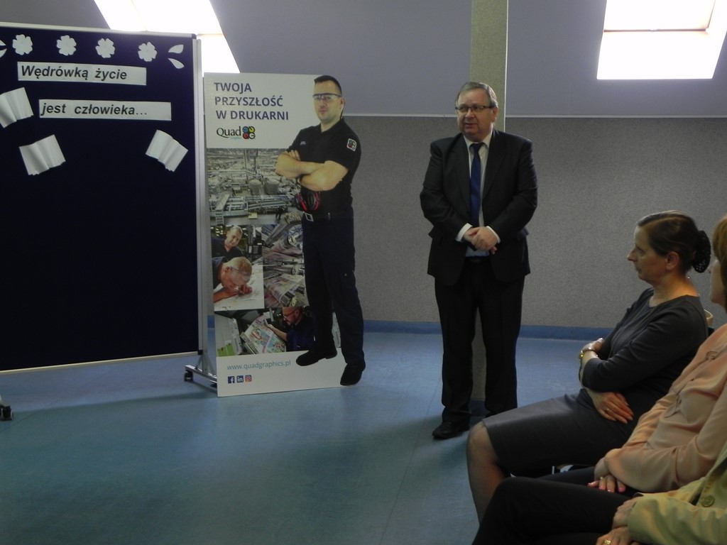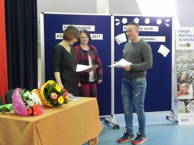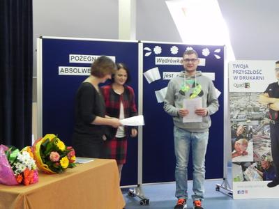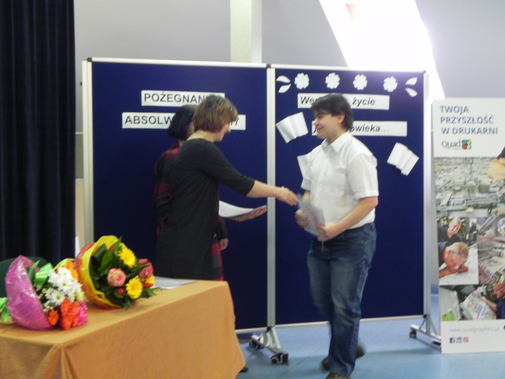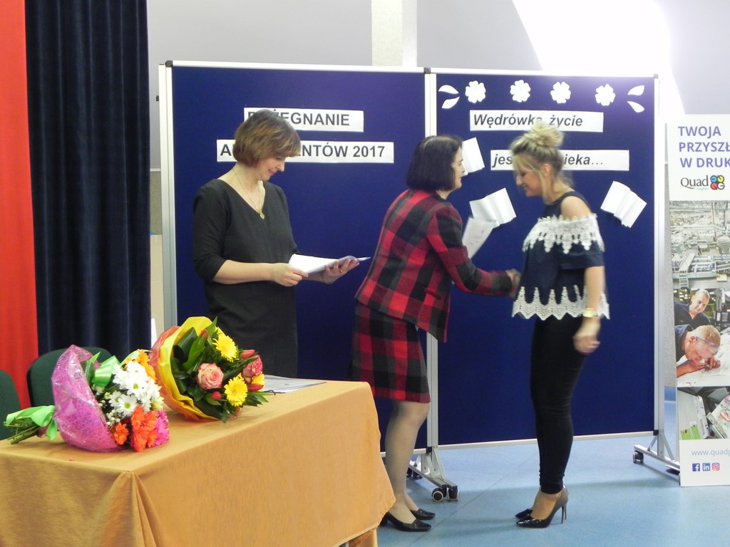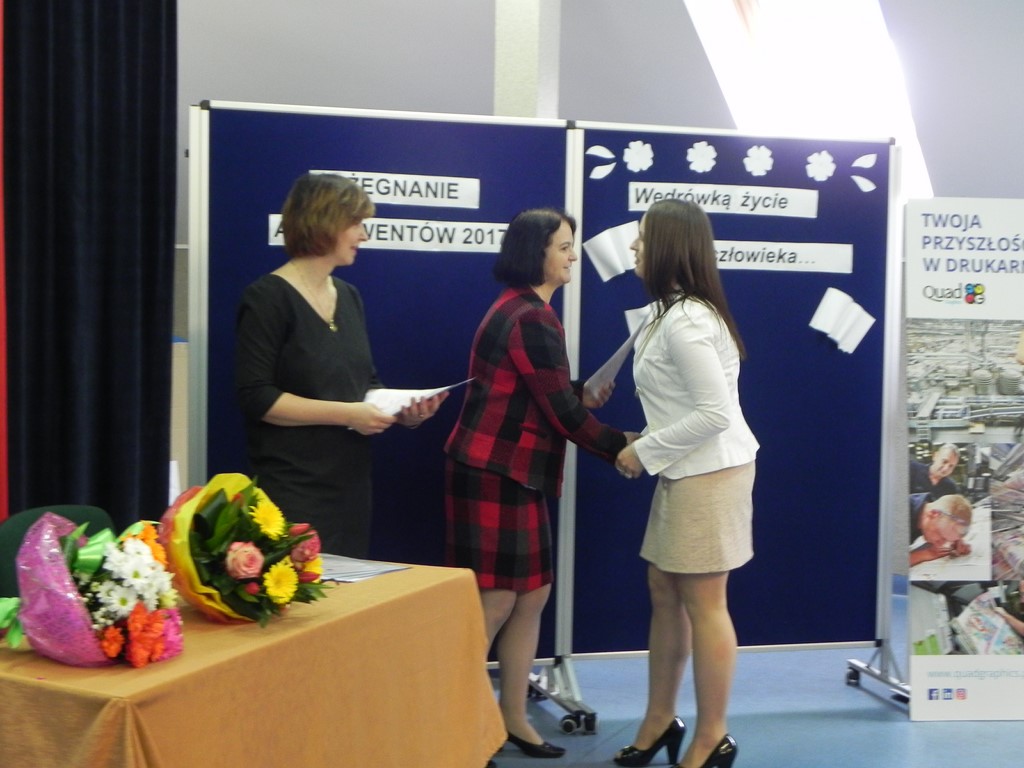 Po wręczeniu świadectw ukończenia szkoły Pani Dyrektor Dorota Stadnik złożyła gratulacje i zachęciła do dalszej nauki. Gościem specjalnym tego dnia była przedstawicielka firmy Quad/Graphics z Wyszkowa, która przedstawiła ofertę pracy i nauki w zawodzie drukarza. Następnie szkolny doradca zawodowy Pani Beata Sierzan zaprezentowała szkolną ofertę kształcenia w zawodzie technik usług kosmetycznych, technik rolnik oraz technik rachunkowości. Są to szkoły policealne dla dorosłych, które pomagają zdobyć nowe kwalifikacje zawodowe i stać się bardziej konkurencyjnym na rynku pracy. BO KWALIFIKACJE ZDOBYTE DZIŚ TO PEWNA PRACA JUTRO.