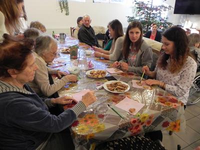 Ważnym elementem działań woluntarystycznych naszych uczniów były także spotkania z mieszkańcami Domu z Sercem w Komorowie. Z okazji Świąt Bożego Narodzenia młodzież przygotowała własnoręcznie robione papierowe kartki z życzeniami oraz upiekła w szkole pierniki, które następnie razem z pensjonariuszami dekorowała. Spotkanie odbyło się w miłej atmosferze wspólnej zabawy, kolędowania, radości, śmiechu i ciekawych historii. Takie wizyty ze starszymi ludźmi są zawsze pełne ciepła i spontanicznych reakcji.