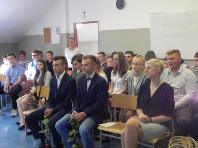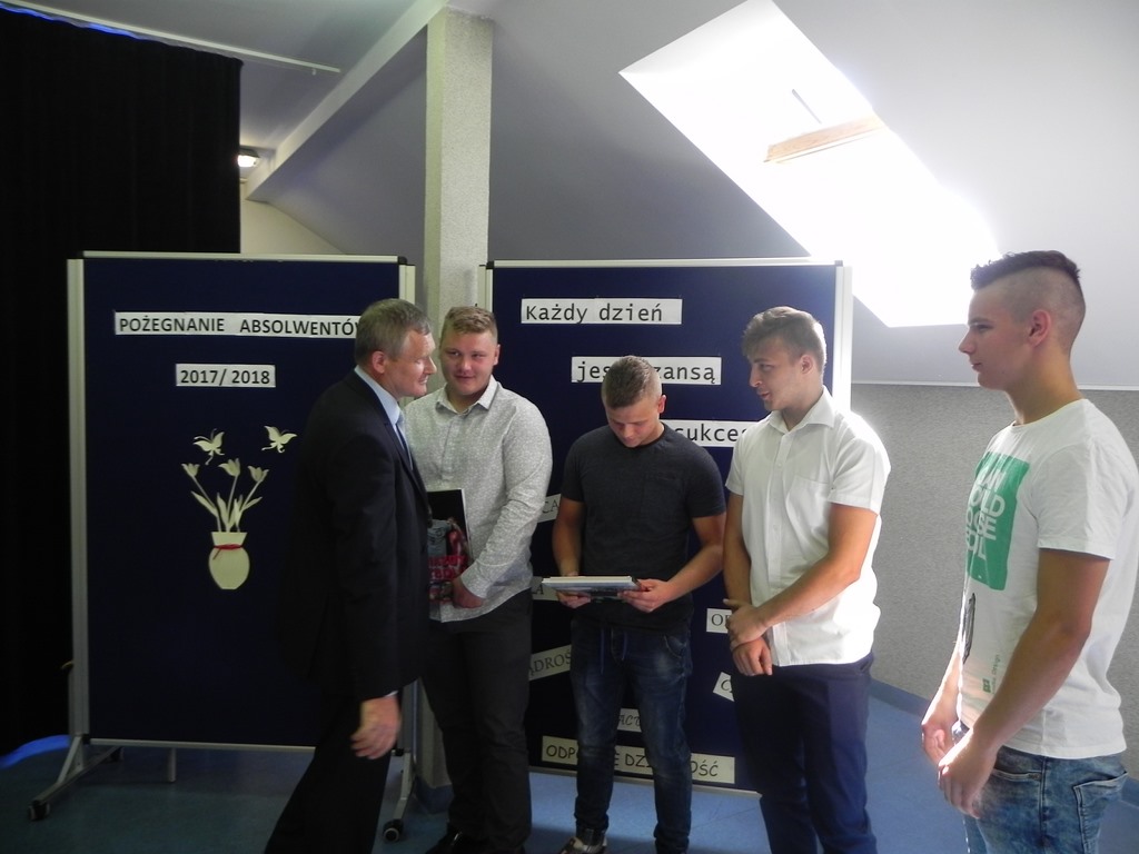 Na zakończenie wysłuchaliśmy życzeń od klasy II dla uczniów kończących szkołę. Przeglądając zdjęcia w kilka minut przypomnieliśmy sobie jak wyglądała ich nauka, praca, zabawa w ciągu tych trzech lat w naszej szkole. Uczniowie klasy II żegnając swoich starszych kolegów powiedzieli: „Życzymy Wam radości wytrwałości, oczekiwania i najpiękniejszych chwil tam, gdzie codziennie zostawicie swoje serce, swój umysł i swoje siły. Życzymy niepokoju, który nie pozwala trwać bezczynnie, szerokiego spojrzenia, które pomaga dostrzegać prawdy ukryte, takiej radości, przy której smutek zamiera, a pragnień tak czystych, że od nich niebo błękitnieje”. Wraz z gratulacjami wręczyli im długopisy do podpisania pierwszej dorosłej umowy o pracę.