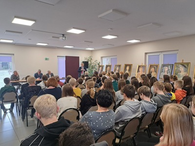 Uczniowie z zaciekawieniem słuchali wykładu dr Leszka Marka Krześniaka -Prezesa Polskiej Fundacji Kościuszkowskiej, kierownika działu edukacji Muzeum Niepodległości, z zawodu lekarza medycyny naturalnej, z zamiłowania i pasji od 55 lat zajmującego się wszystkim co dotyczy Tadeusza Kościuszki.