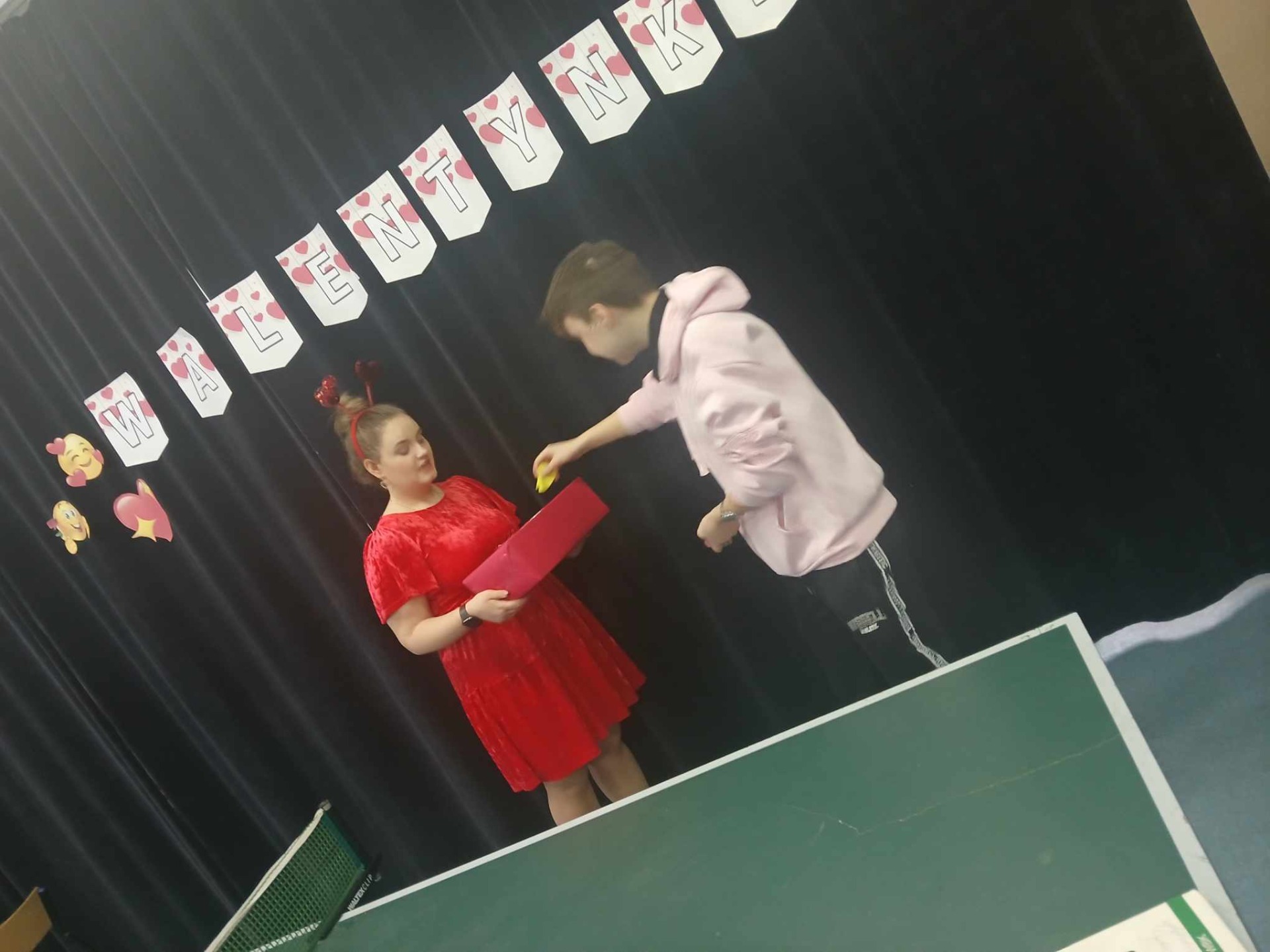 Dzisiaj w naszej szkole świętowaliśmy Walentynki, które stały się wyjątkowym dniem pełnym uśmiechów i radości. Uczennice klasy II SB, Ania Zdunek i Monika Rębowska, zorganizowały wiele atrakcji, które umiliły nam czas. Od samego rana, każdy uczeń i pracownik szkoły otrzymał małą słodkość, co wprowadziło wszystkich w walentynkowy nastrój. Nasi kreatywni uczniowie przygotowali kartki walentynkowe, które później były dostarczane adresatom przez pocztę walentynkową. W kulminacyjnym momencie lekcji wszyscy zebraliśmy się na sali rekreacyjnej, gdzie odbyły się liczne konkurencje. Uczniowie z entuzjazmem przystąpili do zadań, a ich twarze promieniały uśmiechami. Dziewczęta i chłopcy doskonale poradzili sobie z wyzwaniami, odgadując rzeczy podczas konkurencji z kategorii damsko/męskiej. Zabawa była przednia, a atmosfera pełna radości.