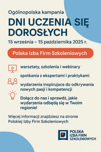Przez cały miesiąc w całej Polsce trwać będzie kampania Dni Uczenia się Dorosłych, organizowana przez Polską Izbę Firm Szkoleniowych. To wyjątkowa inicjatywa, której celem jest promowanie idei uczenia się przez całe życie i pokazanie, że rozwój osobisty i zawodowy nie ma wieku. Krytyczne myślenie to hasło przewodnie tegorocznej edycji kampanii. Inicjatywa kierowana jest do wszystkich grup wiekowych, zawodowych i społecznych.