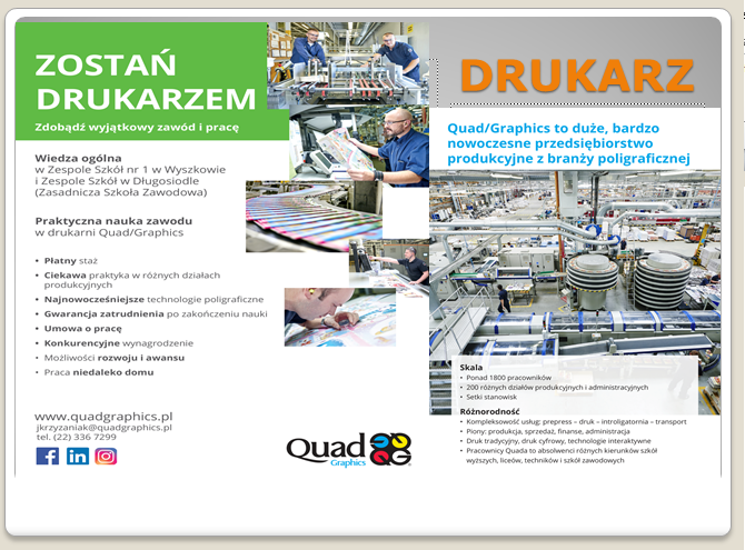 02 lipca 2017 Aktualności Zostań drukarzem – zdobądź wyjątkowy zawód i pracę Zapraszamy do podjęcia nauki w zawodzie drukarz. Praktyki w drukarni Quad Graphics w Wyszkowie. Atuty: ü Płatny staż ( oprócz wynagrodzenia dla pracownika młodocianego z... Czytaj więcej