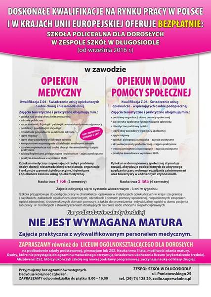 04 lipca 2016 Aktualności ZAPRASZAMY Wszystkich chętnych do podjęcia nauki w szkole policealnej dla dorosłych w zawodzie opiekun medyczny (1 rok) i opiekun w domu pomocy społecznej (2 lata) zapraszamy do Zespołu Szkół w Długosiodle... Czytaj więcej